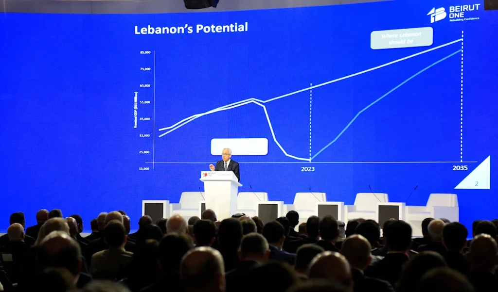 مثلاً، جاء خطاب الممثل عن القطاع التجاري نقولا شماس كأنه «نوستالجيا» تجارية وبيان استعادة مجدٍ مفقود. فأعاد التذكير بالفينيقيين، وبـ«العناقيد الاقتصادية». كما تحدّث عن «صمود» القطاع التجاري. وأعلن شماس عن «فرصة استثمارية» ناتجة من ارتفاع الطلب وانخفاض العرض، سمّاها «حلم المستثمر»، لكنها في الحقيقة إحدى علامات الانهيار.